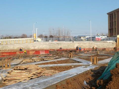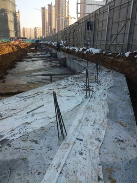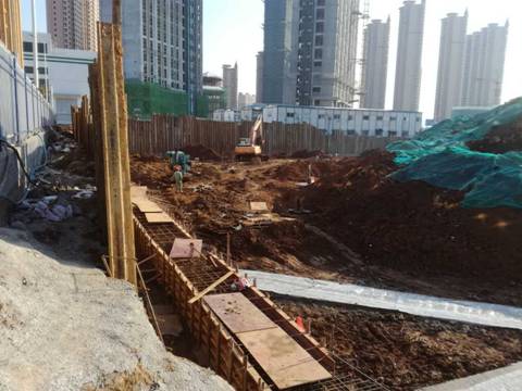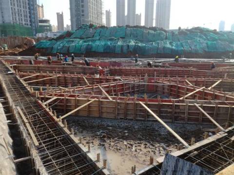 现支护桩、立柱桩均已完成,圈梁(GHJK)段圈梁浇筑完成,BC段挂网喷浆及DEF段钢板桩临时支护完成,圈梁(KABCD)段钢筋绑扎及模板安装完成,B处角撑完成三道支撑梁钢筋绑扎及模板安装。现进行B处角撑其余部位的钢筋绑扎。