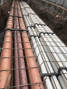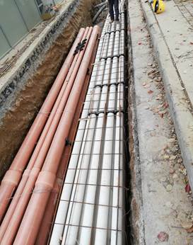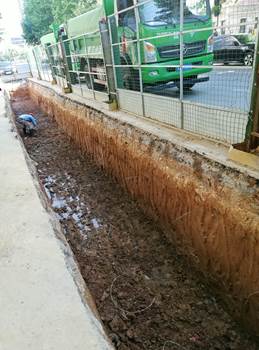 由我南京华彤市政工程有限公司承建的双龙大道与天元路交叉口管线迁移工程,工程地点位于南京市江宁区双龙大道与天元路交叉口,中标时间2018年7月,中标价696.95万元,建设单位为南京江宁经济技术开发总公司。工程开工时间2018年10月,竣工时间2019年5月,工程涵括马浦街、高湖路、庄排路、双龙大道以及过天元中路等5条道路,道路总长2300m,主要工作内容包括路面拆除、沟槽开挖、检查井砌筑、28+10孔强弱电管道铺设及路面恢复施工,过双龙大道采用拖拉管施工,其余部位均采用明挖施工。